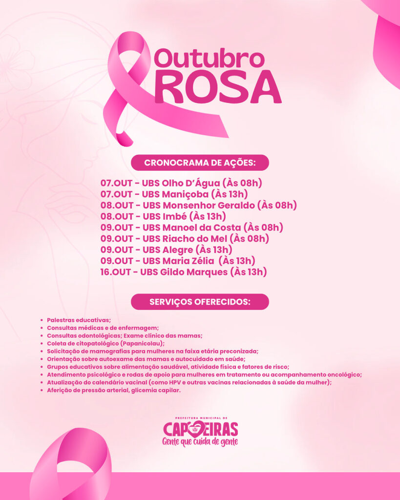 A Prefeitura de Capoeiras, por meio da Secretaria Municipal de Saúde, preparou uma programação especial em alusão ao Outubro Rosa, mês dedicado à conscientização sobre a prevenção e o diagnóstico precoce do câncer de mama e do colo do útero.
