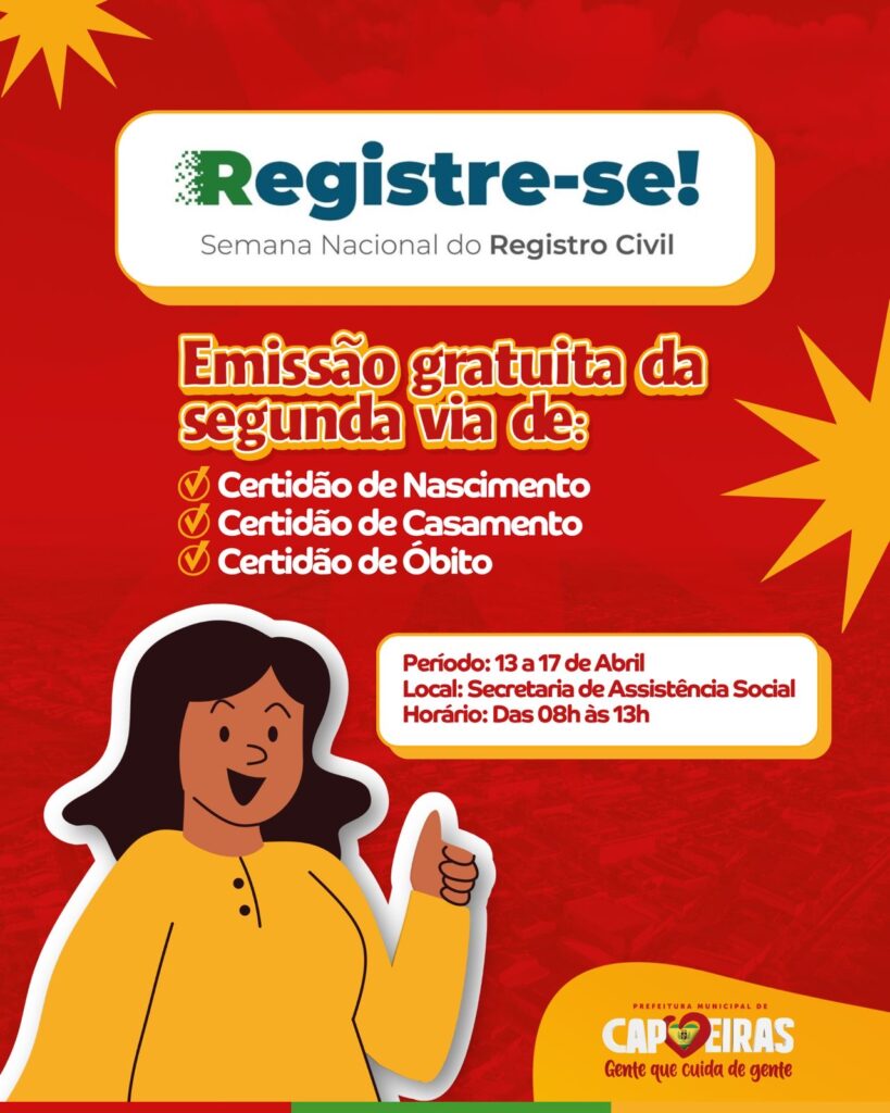 Entre os dias 13 e 17 de abril, o município de Capoeiras integra a Semana Nacional do Registro Civil – Registre-se!, uma iniciativa que visa ampliar o acesso da população à documentação básica.