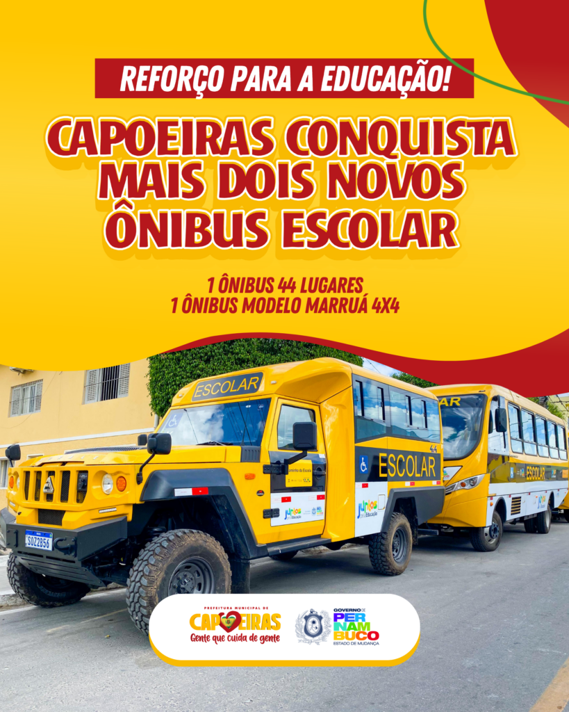 O município de Capoeiras foi contemplado com dois novos ônibus escolares, ampliando e qualificando o transporte dos estudantes da rede pública. Os veículos foram entregues pelo Governo do Estado e passam a reforçar a frota municipal.