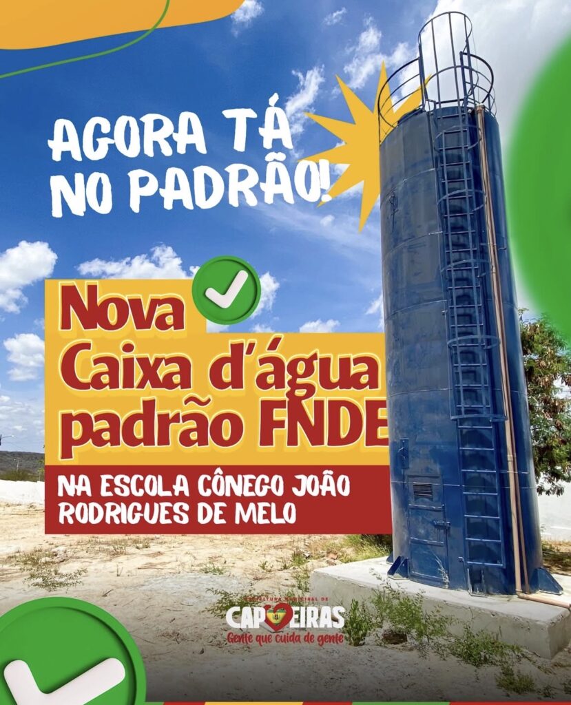 A Prefeitura Municipal concluiu as obras de construção da caixa d’água no padrão FNDE na Escola Cônego João Rodrigues de Melo, localizada no povoado Maniçoba.