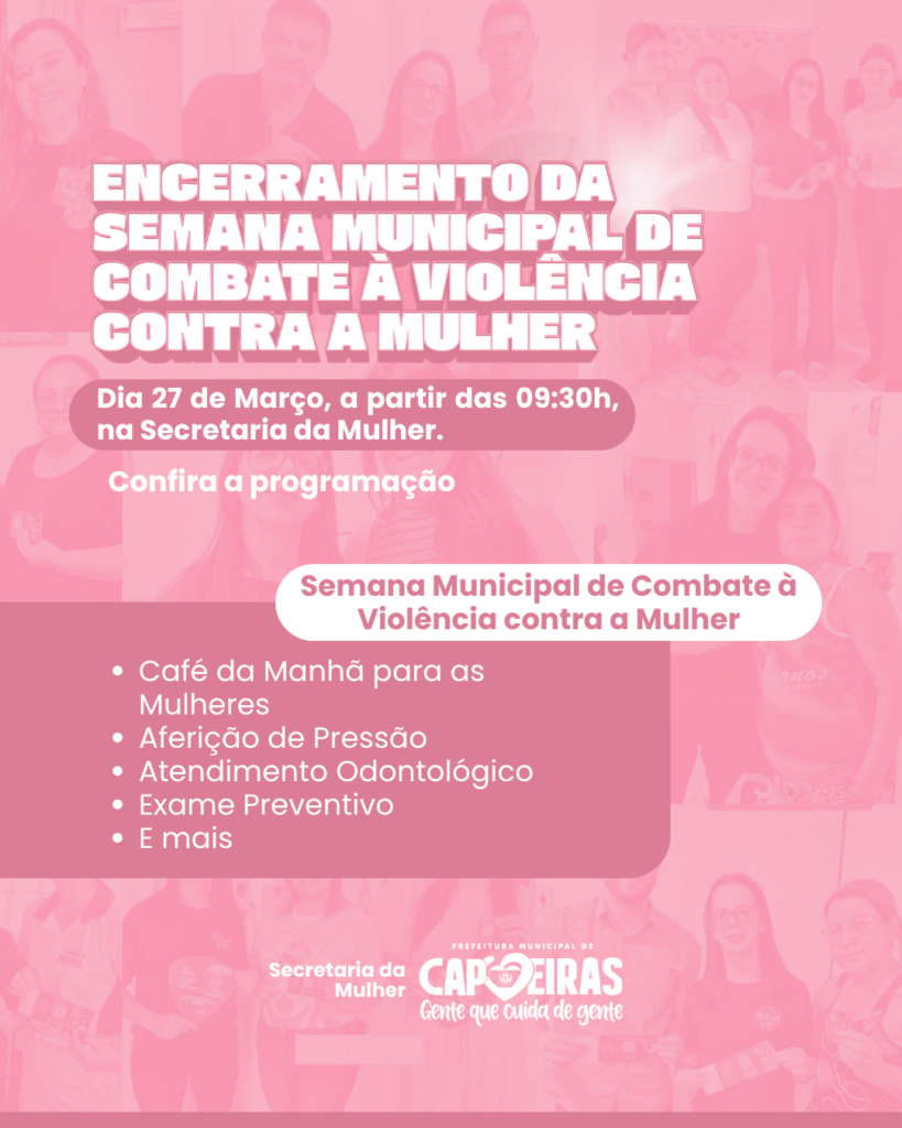 A Prefeitura de Capoeiras, por meio da Secretaria da Mulher, realizará no próximo dia 27 de março, a partir das 09h30, na sede da Secretaria, o encerramento da Semana Municipal de Combate à Violência contra a Mulher.