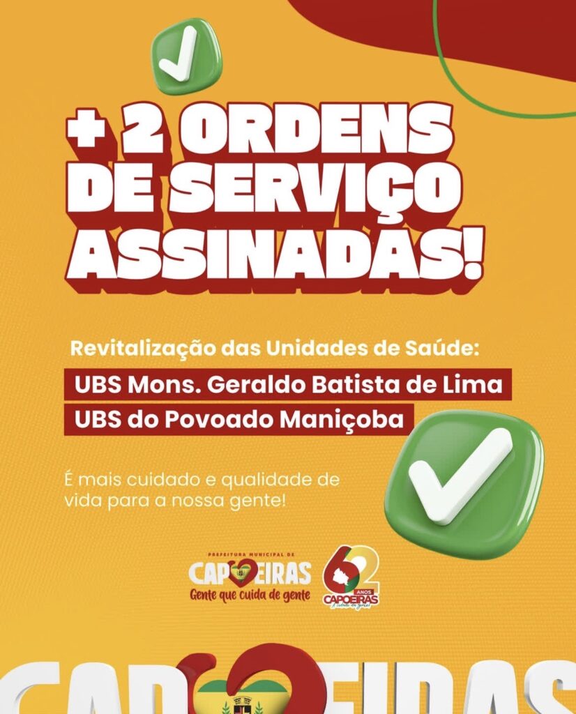 A Prefeitura de Capoeiras autorizou mais duas ordens de serviço para a revitalização de Unidades Básicas de Saúde do município. As melhorias contemplam a UBS Monsenhor Geraldo Batista de Lima, localizada na Vila Vintém, e a UBS do Povoado Maniçoba.
