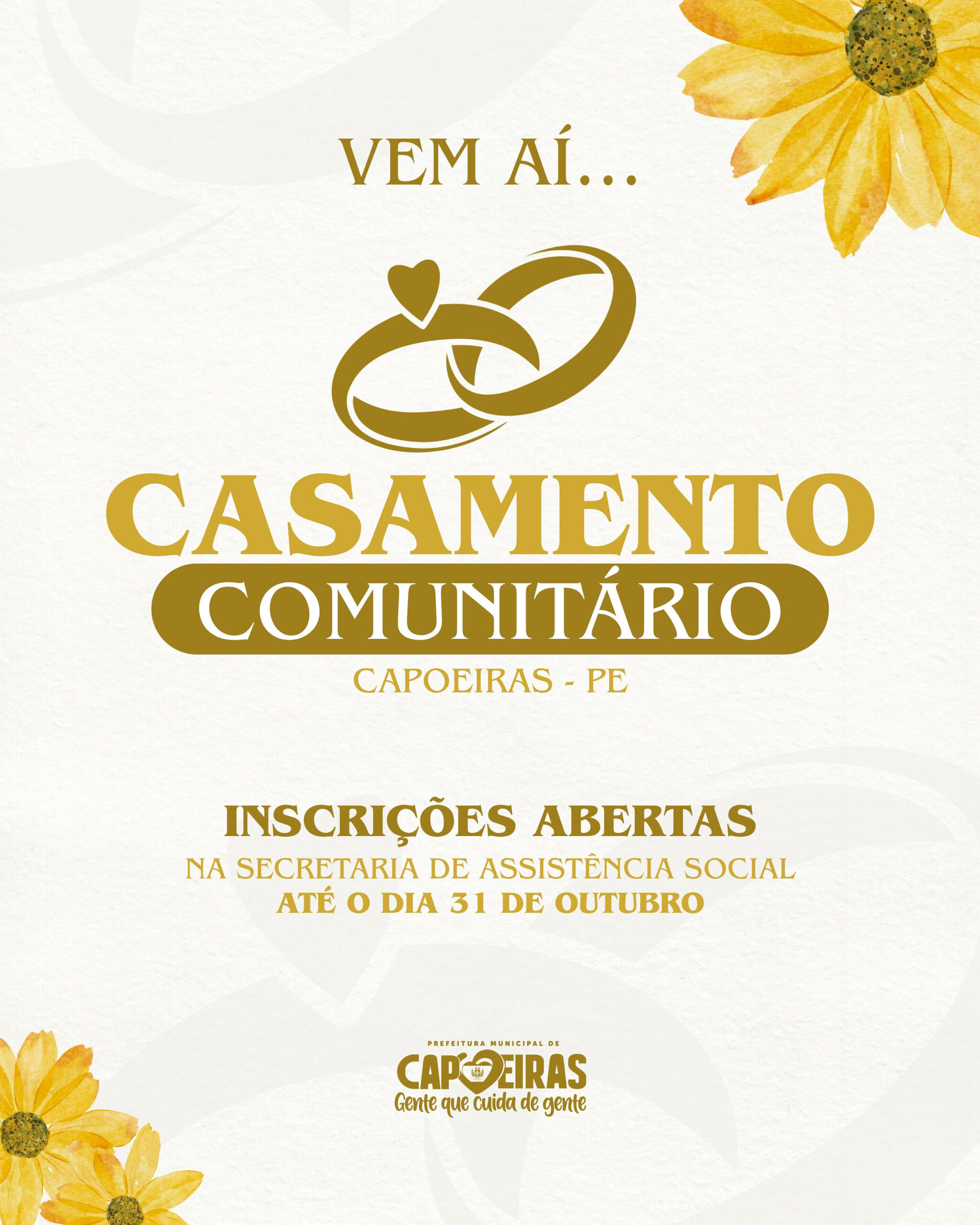 A Prefeitura de Capoeiras, por meio da Secretaria de Assistência Social, está promovendo mais uma edição do Casamento Comunitário, uma iniciativa que tem como objetivo realizar o sonho de diversos casais do município em oficializar a união de forma gratuita e especial. As inscrições já estão abertas e seguem até o dia 31 de outubro.