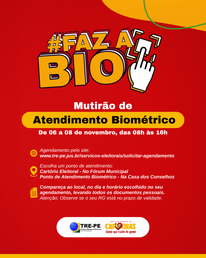 O Tribunal Regional Eleitoral de Pernambuco (TRE-PE) realizará um grande mutirão de atendimento biométrico no município de Capoeiras, entre os dias 06 e 08 de novembro de 2025.